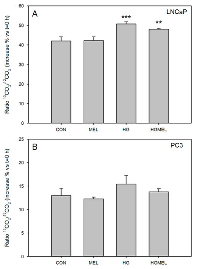 Changes CO2 production by prostate cancer cells. Cells were grown in the presence of 13CO2. 13CO2/12CO2 ratio was calculated in: LNCaP (A); and PC-3 (B) cells after treatment with or without 1 mM MEL after 6 h of culture media supplemented with 2 g/L of U-13C-glucose (CON) or 4 g/L of U-13C-glucose (HG). 13CO2 production was measured at the beginning of the experiment (Time = 0) and at the end of the experiment (Time = 6 h). Results are shown as the increment vs. T0. A representative experiment of three is shown. Data are represented as mean ± SEM (n = 3). ** p < 0.01 vs. CON, *** p < 0.001 vs. CON.