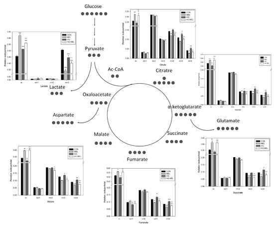 Schematic representation of tricarboxylic acid cycle (TCA) cycle. Black circles represent the number of labeled carbons of each compound. Graphs represented metabolites and their relation isotope/total in 13C among 2 g/L of U-13C-glucose (CON) or 4 g/L of U-13C-glucose (HG) in the presence or absence of melatonin (MEL) 1 mM. “m” represents unlabeled metabolite and “m + n”, labeled in “n” number of carbons. * p < 0.05 vs. CON, ** p < 0.01 vs. CON, *** p < 0.001 vs. CON, + p < 0.05 vs. HG, ++ p < 0.01 vs. HG, +++ p < 0.001 vs. HG.