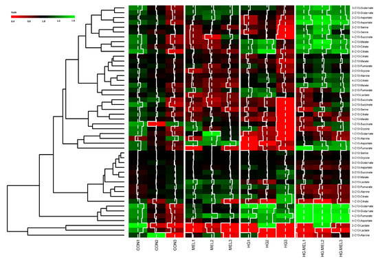 Effect of melatonin on the metabolic profile of LNCaP cells grown in normal or high glucose media. Heat map of log2 fold changes of tricarboxylic acid cycle (TCA) cycle metabolites after 24 h of culture with 2 g/L of U-13C-glucose (CON) or 4 g/L of U-13C-glucose (HG) in the presence or absence of melatonin (MEL) 1 mM. Values of labeled metabolites were normalized to CON group. A color scale from 0.4 (red) to 1.6 (green) was employed to represent the amount of each compound. Red compounds are metabolites with lower levels than CON and green compounds are metabolites with higher levels than CON. Annotations included on left side of the heat map show the clustering of the glucose metabolites studied.