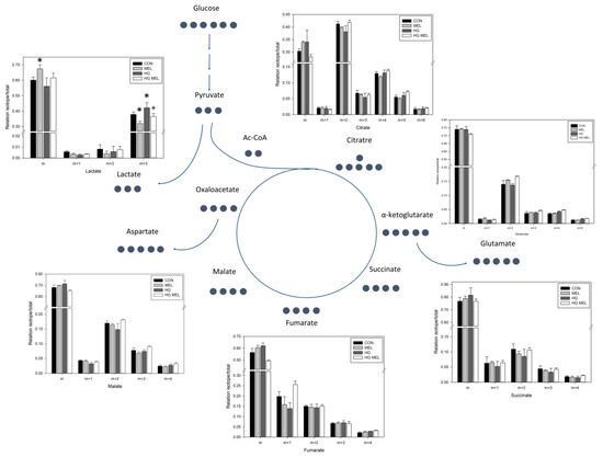 Schematic representation of tricarboxylic acid cycle (TCA). Black circles represent the number of labeled carbons of each compound. Graphs represented metabolites and their relation isotope/total in 13C among 2 g/L of U-13C-glucose (CON) or 4 g/L of U-13C-glucose (HG) in the presence or absence of melatonin (MEL) 1 mM. “m” represents unlabeled metabolite and “m + n”, labeled in “n” number of carbons. * p < 0.05 vs. CON and + p < 0.05 vs. HG