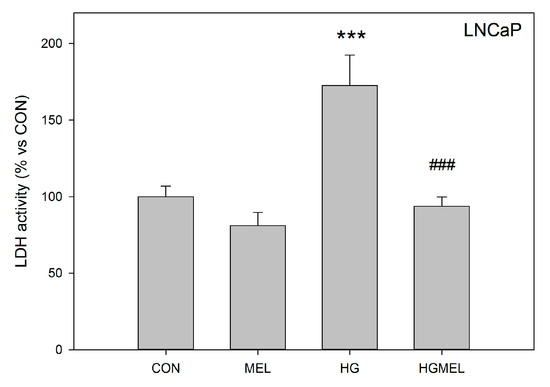 Melatonin decreases lactate dehydrogenase (LDH) activity in LNCaP cells. LDH activity was measured in LNCaP cells after grown in media supplemented with 2 g/L glucose (CON) or 4 g/L glucose (HG) with or without 1 mM melatonin (MEL) for 24 h. Results are shown as the percentage vs. CON group and a representative of three independent experiments is shown. Data are shown as mean ± SEM (n = 3). *** p < 0.001 vs. CON, ### p < 0.01 vs. HG.