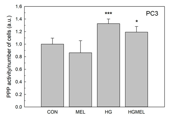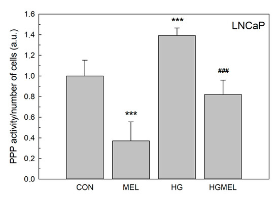 Given that TCA did not change after HG culturing or after melatonin treatment in androgen-independent PC-3 cells, our next goal was to consider whether a potential glycolysis deviation toward the pentose phosphate pathway (PPP) could occur. To this aim, the levels of glucose-6-phosphate dehydrogenase (G6PDH), which is activated upon a higher demand of this biosynthetic pathway, was evaluated. Under normal glucose conditions, incubation with melatonin caused a dramatic reduction in the PPP activity in LNCaP cells (Figure 9). HG media induced a remarkable increase in G6PDH levels in both cell types. More importantly, melatonin totally limited the rise in PPP activity caused by HG in androgen-dependent cells, while there was no significant reduction in G6PDH in PC-3 cells.