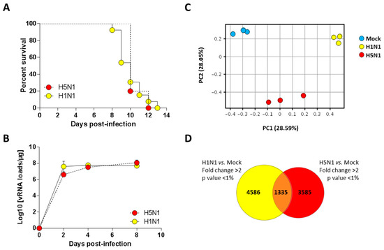 Survival curves and viral loads of infected mice. (A) Lethalities of H5N1 and H1N1 were compared in mice infected with 1.4 × 102 PFU and 1.5 × 105 PFU of H5N1 (n = 10) or H1N1 (n = 13), respectively; (B) Viral load in the lungs of H5- and H1-infected mice were measured using quantitative RT-PCR and expressed as copy numbers per µg of total lung RNA. Results are the mean ± SD obtained from six mice; (C) Principal component analysis of the lung genes normalized expression values. X-axis represents the first dimension (Component 1, 28.59% of the variance) which separates the mock conditions from the infected conditions, the y-axis represents the second dimension (Component 2, 28.05% of the variance) which separates the viral infections (i.e., H1N1 vs. H5N1); (D) Venn diagram depicting the differentially expressed genes (≥2.0-fold change, p-value < 0.05) common or unique to H1N1- and H5N1-infected mice relative to mock-infected mice.