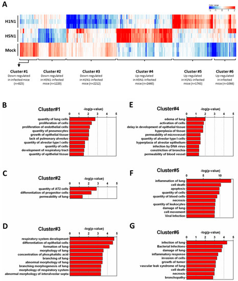 Functional relationships of pathways regulated during infection. Total RNA from mock-, H1N1-, or H5N1-infected C57Bl/6 mice were extracted from lungs at day 4 pi and used to hybridize Agilent’s Whole Mouse Genome Microarray (4 × 44K; G4122F). GeneSpring software (Version 13.0; Agilent Technologies) was used to analyze differences of gene expression between mock-infected mice and H1N1- or H5N1-infected mice. (A) Hierarchical clustering diagrams showing individual replicates are represented. The magnitude of the expression is illustrated by the intensity of the color. Red and blue indicate higher and lower expression level, respectively; (B–G) Molecular and cellular functions associated with differentially expressed genes were compared using IPA. Each cluster was separately analyzed and annotations were ranked using the p-value obtained using the right-tailed Fisher’s exact test, it represents the probability of each biological function to be involved in the group of analyzed genes.