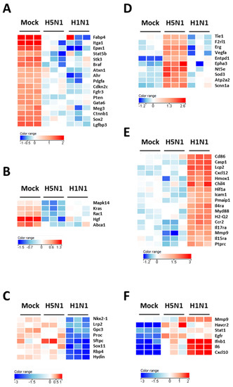 Heat maps of selected genes in the lungs of mock- H1N1- and H5N1-infected mice at day 4 pi. Representative genes of each cluster were selected and represented as a heat map. Genes shown in red are upregulated and genes in blue are downregulated. The magnitude of the regulation is illustrated by the intensity of the color. (A) Heat map of genes from cluster 1 and related to growth of epithelial tissue; (B) Heat map of genes from cluster 2 and related to quantity of AT2 cells; (C) Heat map of genes from cluster 3 and related to respiratory system development; (D) Heat map of genes from cluster 4 and related to edema of lung; (E) Heat map of genes from cluster 5 and related to inflammation of lung; (F) Heat map of genes from cluster 6 and related to infection of lung.