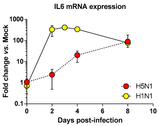 We next focused on the genes upregulated by the IAV infections: cluster 4 (upregulated in H5N1-infected mice; Figure 2E), cluster 5 (upregulated in H1N1-infected mice; Figure 2F), and cluster 6 (upregulated in both IAV-infected mice; Figure 2G). When examining the cellular genes commonly induced during both viral infection (i.e., cluster 6), the ontological analysis showed a clear host defense signature: infection of lung and inflammatory response associated with a pathological signature: damage of lung, necrosis, bronchopathy (Figure 2G). This cluster comprised 1066 genes including Ifnb1, Stat1, Il6, and Cxcl10 (Figure 3F). The same type of response is observed for cluster 5 (upregulated in H1N1-infected mice): inflammation of lung, cell death, necrosis, and damage of lung. This suggests that, at this time point, the signature related to host response and pathogenesis plays a more important role in H1N1-infected mice in comparison to H5N1-infected mice. The pronounced inflammatory response characterizing the H1N1 infection is illustrated in the heat map presented in Figure 3E. In order to validate the microarray expression data, we quantified the IL6 mRNA expression during the course of infection by the 2 IAV. As shown in Figure 4, the kinetic of expression of this major inflammatory cytokine clearly shows differences of expression depending on the type of the virus. The level of expression of IL6 is 10 to 100 times more important during the early steps of H1N1 infection (i.e., between two and four days pi), confirming the major inflammation of the H1N1-infected lungs.