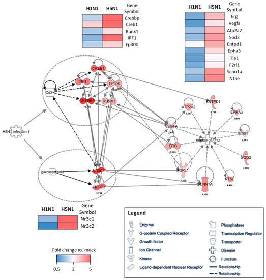 Gene–gene interaction networks of the edema signature. IPA was used to enrich the gene network with possible upstream regulators. Direct interaction between two genes is shown as a solid line and indirect interaction is depicted as a dashed line (based on literature reports). The fold change expression of H5N1-infected mice vs. mock-infected mice is indicated at the bottom of each node. The comparison of the mean level of expression (fold change vs. mock) of each gene between H1N1 and H5N1 infected condition is represented as heat maps.