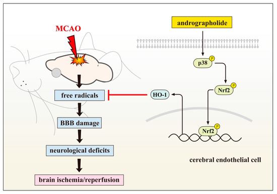 Andrographolide expressively suppressed free radical formation, blood-brain barrier (BBB) disruption, and brain infarction in middle cerebral artery occlusion (MCAO)-insulted rats. The mechanism of this effect was attributable to HO-1 activation. From this study, it is established that andrographolide provides protection against MCAO-induced brain ischemic injury via increased Nrf2-HO-1 expression through p38MAPK regulation.
