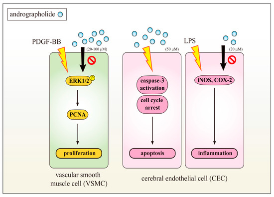 Andrographolide inhibited platelet-derived growth factor-BB (PDGF-BB) induced vascular smooth muscle cell (VSMC) proliferation via reducing extracellular signal-regulated kinase (ERK1/2), and inhibiting the expression of proliferating cell nuclear antigen (PCNA) in the G1 and S phases of the cell cycle. Andrographolide also reduced lipopolysaccharide (LPS)-induced inducible nitric oxide synthase (iNOS) and cyclooxygenase-2 (COX2) expression in inflammatory cerebral endothelial cells (CECs). Andrographolide induced CEC apoptosis and caspase-3 activation, and also arrested CEC cell cycle at the G0/G1 phase. These results suggested that the effects of andrographolide against VSMCs proliferation and CECs dysfunction may represent a promising approach for treatment of vascular diseases.