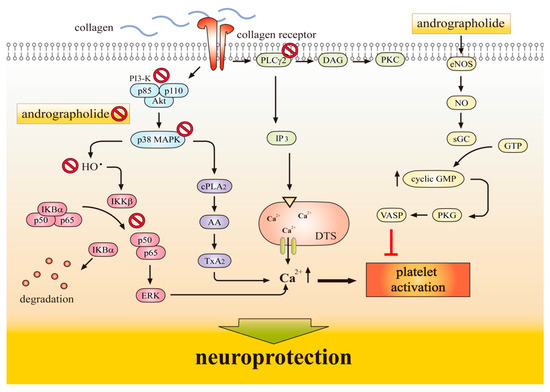 Andrographolide’s antiplatelet effects conferring neuroprotection. Collagen binds to its receptors and then activates both the PLCγ2-DAG-PKC and PI3 kinase/AKT-p38MAPK cascades. p38 MAPK can activate cPLA2, which catalyzes AA release to produce TxA2 formation. Andrographolide can activate the eNOS–NO–cyclic GMP pathway, followed by the inhibition of both the PLCγ2-DAG-PKC and PI3 kinase/AKT cascades, and ultimately inhibits platelet aggregation. Collagen triggers p38MAPK activation and hydroxyl radical (OH−) formation, followed by activation of NFκB including IKKβ phosphorylation, IκBα protein degradation, and p65 phosphorylation, subsequent activation of ERK2 phosphorylation, and finally triggering of [Ca2+]i mobilization and platelet activation. Andrographolide activates cyclic GMP/cyclic GMP-dependent kinase (PKG), and then inhibits the p38 MAPK-HO−-NFκB-ERK2 cascade which finally inhibits platelet activation. These findings suggested that the effects of andrographolide on platelet function may contribute to its neuroprotective effects. sGC: soluble guanylate cyclase; VASP: vasodilator-stimulated phosphoprotein; DTS: dense tubular system; AA: arachidonic acid; TxA2: thromboxane A2.