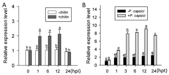 Transcript levels of ChiIV3 in pepper plant in response to exogenously applied chitin treatment and Phytophthora capsici inoculation. (A) The relative transcript levels of ChiIV3 detected in the pepper leaves inoculated with 10 μL P. capsici zoospores (OD595 = 0.6) at different time-points. Hpi, hours post inoculation; (B) The transcript level of ChiIV3 can be significantly induced in pepper leaves treated with applied chitin. Hpt, hours post treatment. (A,B) The expression level of untreated plants was set to “1”. Values are means ± SD (n = 3). Different letters indicate significant differences determined by Fisher’s protected least significant difference (LSD) test (p < 0.05).