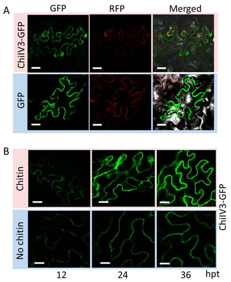 The function of a given protein is closely related to its subcellular targeting. Therefore, unveiling the subcellular localization of ChiIV3 can help us to have a comprehensive description of its function. Keeping this point in view, we generated fused gene vectors of ChiIV3-GFP and SRC2-1-RFP (as a control targeting to the plasma membrane) both driven by the constitutive 35S promoter (p35S:ChiIV3-GFP). GV3101 cells containing p35S:ChiIV3-GFP and GV3101 cells containing p35S:SRC2-1-RFP were co-infiltrated into the leaves of 7-week-old Nicotiana benthamiana (N. benthamiana) plants []. The co-infiltrated leaves were collected for fluorescence detection at 2 dpi (days post infiltration) with a confocal microscope (Figure 2A). We found that green fluorescent protein) (GFP) signal of ChiIV3-GFP was only observed in the plasma membrane, in accordance with our observation with SRC2-1-RFP. Contrary to the given situation, the signal of GFP in control N. benthamiana leaves was observed in multiple subcellular compartments including the cytoplasm and nuclei. To further elucidate the spatio-temporal regulation of ChiIV3 activation triggered by applied chitin treatment, we constructed a fused gene vector of ChiIV3-GFP driven by its native promoter (pChiIV3) and designated as pChiIV3:ChiIV3-GFP. We treated the pChiIV3:ChiIV3-GFP-transiently expressed N. benthamiana leaves with applied chitin. In time-lapse analysis, the fluorescent signals were detected at 12 h intervals after applied chitin treatment by confocal microscope. The result showed that fluorescent signals of N. benthamiana leaves transiently expressed ChiIV3-GFP driven by its native promoter were observed at the plasma membrane (PM ) and the signals can be induced by applied chitin treatment (Figure 2B). The ChiIV3-GFP fluorescent signals in the N. benthamiana leaves were lower in the absence of chitin treatment. Together, these results indicated that ChiIV3 is activated at the PM of N. benthamiana cells after applied chitin treatment.