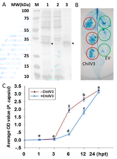 Prokaryotically expressed ChiIV3 inhibited the growth of P. capsici culturing in V8 medium. (A) SDS-PAGE assay was performed to confirm the expression level of ChiIV3 in Escherichia coli cells (BL21). The SDS-PAGE gel was stained with Coomassie Brilliant Blue (CBB) and scanned by a scanner. M, protein ladder marker; 1, pET32a-ChiIV3; 2, pET32a; 3, purified ChiIV3 protein. Asterisks represent the prokaryotically expressed ChiIV3 protein; (B) Trypan blue staining was performed to evaluate the cell death in pepper leaves triggered by purified prokaryotically expressed ChIV3 protein. Red and green circles indicate full and no cell death, respectively; (C) The purified prokaryotically expressed ChiIV3 suppressed the growth of P. capsici culturing in V8 medium. The P. capsici was first cultured in V8 medium, followed by supplemented with 500 ng prokaryotically expressed ChiIV3, and the OD595 of P. capsici mycelia was measured at different time-points after treatment. Values are means ± SD (n = 6). Hpt, hours post treatment. Different letters indicate significant differences determined by Fisher’s protected LSD test (p < 0.05).