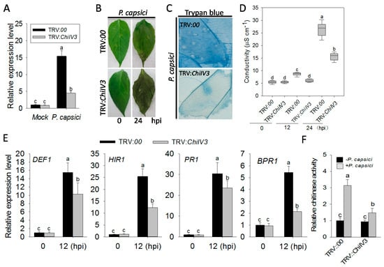 The silencing of ChiIV3 by virus-induced gene silencing (VIGS) enhanced the susceptibility of pepper to P. capsici inoculation. (A) Quantitative reverse transcription-PCR (qRT-PCR) analysis of the transcript levels of ChiIV3 in ChiIV3-silenced pepper plants inoculated with P. capsici. The transcript level of ChiIV3 in the mock-treated pepper (ddH2O) leaves was set to “1”; (B) The disease symptoms of ChiIV3-silenced pepper plants at 24 h after inoculated with P. capsici spores. Hpt, hours post inoculation; (C) Trypan blue staining and (D) conductivity measurement of ChiIV3-silenced or unsilenced pepper leaves at 24 h post inoculation of 10 μL P. capsici zoospores (OD59 = 0.6). Photos were taken by a camera (Canon) at 24 hpi; (E) Determination of the transcript levels of defense-related marker genes in ChiIV3-silenced or unsilenced pepper leaves at 12 hpi of P. capsici spores, compared to the untreated pepper plants. DEF1, a pepper defensing gene in response to pathogen infection; HIR1, a pepper gene encodes a hypersensitive induced reaction (HIR) protein; PR1, pathogenesis-related protein 1; BPR1, the defense-related genes BPR1 (basic PR-1). The transcript level of all marker genes in unsilenced pepper plants without treatment was set to an expression value of “1”. Hpi, hours post inoculation; (F) The relative chitinase activity of ChiIV3-silenced or unsilenced pepper plants at 24 hpi of P. capsici spores. The chitinase activity of unsilenced pepper plants treated with buffer (mock) was set to 1. (A,D,E) Values are means ± SD (n = 6). Different letters indicate significant differences determined by Fisher’s protected LSD test (p < 0.05).