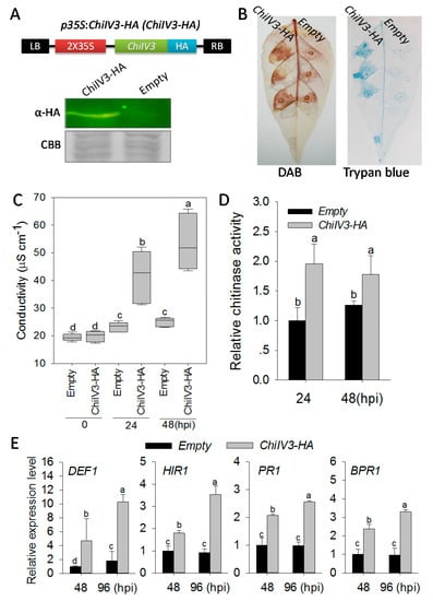 Transient overexpression of ChiIV3 triggered intensive cell death in pepper leaves. (A) The schematic diagram of the p35S:ChiIV3-HA vector and the immunoblotting analysis of ChiIV3-HA transiently expressed in pepper leaves. An anti-HA antibody was used to detect ChiIV3-HA fused protein in the immunoblotting analysis. CBB was used to normalize the total protein levels. 2 × 35S, two copies of the cauliflower mosaic virus 35S promoter; LB, left border; RB, right border; CBB, Coomassie Brilliant Blue; α-HA, α-hemagglutinin (HA) antibody; (B) The DAB and trypan blue staining of pepper leaves transiently overexpressed ChiIV3-HA (p35S:ChiIV3-HA) at 48 hpi (OD595 = 0.6). The experiment was performed three times independently with similar results obtained each time. DAB, DAB staining; Trypan blue, trypan blue staining; (C) Conductivity measurement of discs of pepper leaves infiltrated with GV3101 cells harboring p35S:ChiIV3-HA or p35S:00 (control). Hpi, hours post infiltration; (D) The relative chitin content of pepper leaves transiently overexpressed ChiIV3-HA. The chitin content of the control pepper leaves (expressed p35S:00) was set to “1”. Hpi, hours post infiltration; (E) Quantification of transcript levels of defense-related marker genes in ChiIV3-HA transiently overexpressed pepper leaves at different time-points. DEF1, a pepper defensing gene in response to pathogen infection; HIR1, a pepper gene encodes a hypersensitive induced reaction (HIR) protein; PR1, PATHOGENESISRELATED PROTEIN1; BPR1, the defense-related genes BPR1 (basic PR-1). The transcript levels of the marker genes in the control pepper leaves (transiently expressing p35S:00 at 48 hpi was set to “1”. Hpi, hours post infiltration; (C–E) Values are means ± SD (n = 6). Error bars indicate SD. Different letters indicate significant differences determined by Fisher’s protected LSD test (p < 0.05).