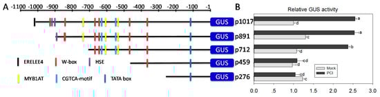 The inducible expression of ChilV3 against PCI is supposed to be conferred by its promoter through binding by specific transcription factors (TFs). To determine the crucial promoter region and the possible cis-elements responsible for the response of pChilV3 to P. capsici inoculation, 5’ deletion assay was conducted. Based on the distribution of cis-elements possibly responsible for biotic and abiotic responses, five 5′ deletions of pChiIV3 beginning from −1017, −891, −712, −459, and −276 bp to the initiation codon were amplified and cloned into upstream of GUS reporter gene in the destination vector pDMC163 (Figure 6A). EHA105 cells containing the generated constructs above were transformed into tobacco plants to get the T0 plants and their corresponding T1, T2, and T3 lines. With the plants of homozygous T3 tobacco lines, the promoter region responsible for P. capsici response was assayed with GUS activity quantification against PC inoculation (Figure 6B). We observed that −1017, −892, and −712 bp deletions were sufficient to trigger the GUS expression under P. capsici challenge, while GUS expression driven by the −459 and −276 bp deletions failed to be induced by PC inoculation. The result demonstrated that the promoter region located between −712 and −459 bp is essential for the induction of ChiIV3 in response to P. capsici inoculation.