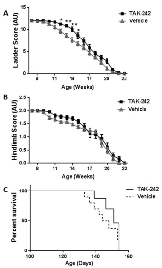 APA StyleFellner, A., Barhum, Y., Angel, A., Perets, N., Steiner, I., Offen, D., & Lev, N. (2017). Toll-Like Receptor-4 Inhibitor TAK-242 Attenuates Motor Dysfunction and Spinal Cord Pathology in an Amyotrophic Lateral Sclerosis Mouse Model. International Journal of Molecular Sciences, 18(8), 1666. https://doi.org/10.3390/ijms18081666