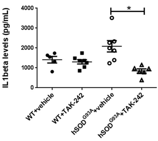 2.3. TAK-242 Treatment Decreased Serum IL1-β Levels in hSOD1G93A Mice