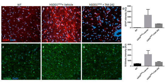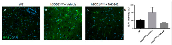 2.5. TAK-242 Treatment Attenuated Spinal Cord Astrogliosis and Microglia Activation in hSOD1G93A Mice