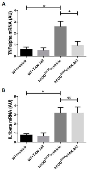2.6. TAK-242 Treatment Attenuated TNF-α but Not IL1-β Expression in the Spinal Cords of hSOD1G93A Mice