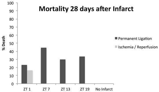 Sixty-five mice were operated. During follow-up, 13 mice (20%; all PL/IR) had died or were euthanized because a humane endpoint was reached. Twelve of the thirteen dead animals had undergone PL, and the majority (11/13) died within the first week after the infarct. Mortality was highest in the animals operated at ZT 7 (the middle of the inactive/resting period), although differences were not statistically significant (Figure 1; p = 0.77).