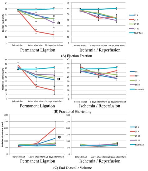 Cardiac function decreased in the PL and IR groups and was significantly worse compared to the sham group 28 days after the infarct (Table 1 and Figure 3). Cosinor analysis revealed that functional impairment varied significantly with a 24-h period based on the timing of coronary artery ligation in the mice receiving PL, with peak damage occurring after coronary artery ligation at ZT7 (the middle of the inactive/resting period; p = 0.041, p = 0.049, and 0.021 for Left ventricular ejection fraction (EF), fractional shortening (FS), and end diastolic volume (EDV) respectively, n = 20). In the IR mice however, no circadian dependence was observed (p = 0.598, 0.127, and 0.368 for EF, FS, and EDV respectively, n = 18).
