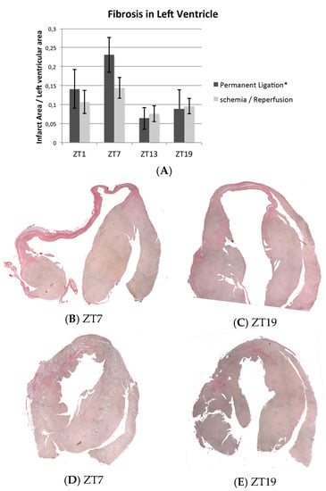 Picosirius-red staining of myocardial infarcts. The pink tissue represents fibrosis. (A) Fibrosis quantification; a 24-h rhythm in amount of fibrosis, based on the time of coronary artery ligation was present in PL but not IR. n = 20, 18, and 14 for PL, IR, and sham respectively, n = 3–5 per time point; (B–C) representative examples of permanent ligation. Infarcts induced at ZT7 (B, middle of inactive/resting period) were larger compared to infarcts induced at ZT19 (C, middle of the active period); (D–E) representative examples of Ischemia/reperfusion. No differences were found between time points. * Indicates p < 0.05 for 24-h rhythm. ZT: Zeitgeber Time (ZT0 = lights on).