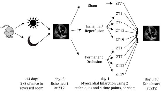 Overview of the procedure. Two-thirds of all mice were placed in rooms with altered light/dark regimes. Five days before the procedure, baseline echocardiography was performed. On Day 1, myocardial infarction (or sham) was induced at four different time-points using two different techniques. At 5 and 28 days, outcome was measured using echocardiography. ZT: Zeitgeber Time (ZT0 = lights on).