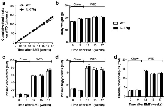 Successful expression of human IL-37 in hematopoietic cells does not affect metabolic parameters. Ldlr⁻/⁻ mice were transplanted with bone marrow from IL-37tg or control wild-type (WT) mice. After nine weeks of recovery on regular chow diet, mice were fed a Western-type diet (WTD) for eight weeks. Cumulative food intake (a) body weight (b) and 4-hour-fasted plasma levels of cholesterol (c) triglycerides (d) and phospholipids (e) were monitored during the study. Data are expressed as means ± standard error of the mean (SEM); n = 14–15 per group. BMT, bone marrow transplantation.