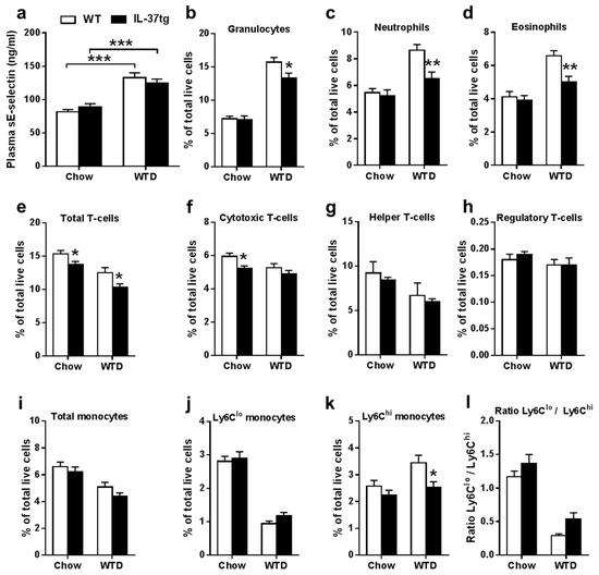 Next, we evaluated the effect of hematopoietic IL-37 expression on inflammatory parameters. WTD-feeding increased plasma sE-selectin as compared to chow-feeding, thereby confirming the induction of low-grade inflammation by the WTD, but hematopoietic IL-37 expression did not reduce plasma sE-selectin (Figure 2a). However, flow cytometry of blood cells showed that hematopoietic IL-37 expression reduced the number of circulating immune cells as evident from reduced circulating granulocytes (Figure 2b), neutrophils (Figure 2c), and eosinophils (Figure 2d) during WTD-feeding. In addition, total T-lymphocytes were reduced during chow- and WTD-feeding (Figure 2e) and cytotoxic T-cells were significantly reduced during chow-feeding (Figure 2f). In contrast, expression of IL-37 did not influence helper T-cells (Figure 2g) and regulatory T-cells (Figure 2h). Although hematopoietic IL-37 expression did not affect the percentage of total circulating monocytes (Figure 2i) or Ly6Clo monocytes (Figure 2j), IL-37 expression reduced the number of newly recruited Ly6Chi monocytes (Figure 2k). The ratio of Ly6Clo versus Ly6Chi monocytes was not significantly increased (Figure 2I). Taken together, these data indicate a reduced inflammatory state by hematopoietic IL-37 expression.