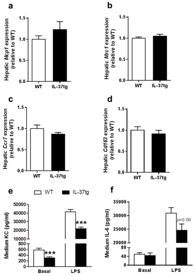 Monocytes can differentiate into either classically activated macrophages that secrete pro-inflammatory cytokines (i.e., M1 macrophages), or alternatively activated macrophages that secrete anti-inflammatory cytokines (i.e., M2 macrophages). To evaluate the effects of hematopoietic IL-37 expression on macrophage polarization, we measured mRNA expression of M1 and M2 phenotype markers in the liver, a main organ where macrophages reside [18] and which are replenished by bone marrow transplantation (BMT). Hematopoietic IL-37 expression influenced mRNA levels of neither the M1 phenotype markers monocyte chemotactic protein 1 (Mcp1) and mannose receptor C-type 1 (Mrc1) nor the M2 phenotype markers C-C chemokine receptor type 7 (Ccr7) and cluster of differentiations 163 (Cd163) (Figure 3a–d). These data indicate that hematopoietic IL-37 expression did not change macrophage polarization.