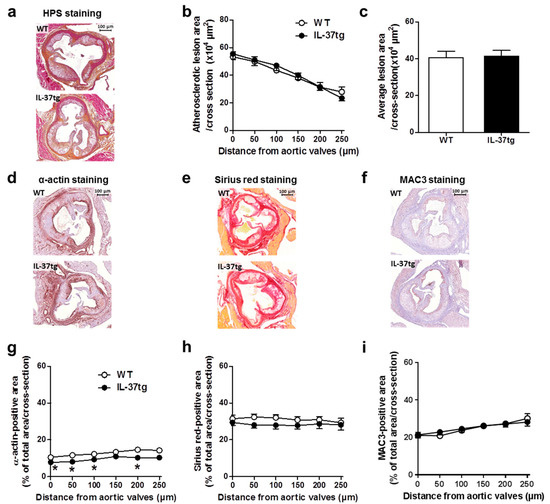Finally, we assessed whether the reduced inflammatory state of hematopoietic IL-37 expression would attenuate atherosclerosis development. To this end, we determined the atherosclerotic lesion area in the valve area of the aortic root of the heart as well as atherosclerotic lesion composition after eight weeks of WTD-feeding. Although the atherosclerotic lesion area was unaffected throughout the aortic root of the heart (Figure 4a–c), IL-37 expression reduced the smooth muscle cell content of the atherosclerotic lesions (Figure 4d,g). Both the collagen content (Figure 4e,h) and the macrophage content (Figure 4f,i) remained unchanged between both groups. Taken together, these findings indicate that hematopoietic IL-37 expression marginally affects lesion composition without a strong effect on atherosclerotic lesion size.