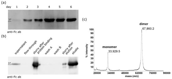 The conjugate developed here is based on the molecule named ZHER2:2891, which exhibits increased thermal stability and hydrophilicity along with lower liver uptake in animals when compared to the parental ZHER2:342 affibody [,]. To expand the size of our construct, we fused the ZHER2:2891 molecule to the Fc fragment of IgG1 (Figure 1). A similar fusion was previously proposed by Rönnmark et al. (2002) who fused the Tag DNA polymerase specific affibody to the Fc fragment and purified this construct from E. coli cells []. However, the ZHER2:2891-Fc fusion protein was expressed in Chinese Hamster Ovary CHO-S cells to ensure its proper folding and glycosylation [,]. The highest levels of ZHER2:2891-Fc in the culture medium were observed since day 4 following the transfection with pLEV113-ZHER2:2891-Fc (Figure 2a). Therefore, ZHER2:2891-Fc was purified on day 5 or day 6 using a single-step affinity chromatography on protein A-Sepharose. The purification process was analyzed by Western blotting with the anti-Fc antibody conjugated with HRP (Figure 2b). The ZHER2:2891-Fc fusion migrated as a 36-kDa band in SDS-PAGE in the presence of the reducing agent, β-mercaptoethanol (5%), in Laemmli sample buffer. Additionally, the identity and purity of the product were confirmed by mass spectrometry (MS) (Figure 2c). The detected m/z peaks corresponded to a covalent dimer (67,860.2 Da) and monomer (33,929.5 Da) of the ZHER2:2891-Fc after cleavage of a 19 amino acid-long secretion signal peptide (2273.7 Da). We obtained 1.5 mg of the ZHER2:2891-Fc protein from 1 liter of CHO-S culture.
