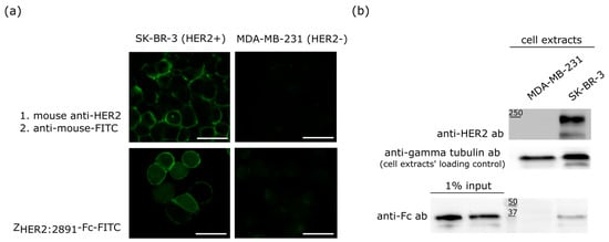 Our previous study clearly demonstrated that ZHER2:2891 selectively recognized HER2 receptor present on the surface of cancer cell lines that overexpress this receptor []. Since the proposed fusion contains the same targeting molecule, we verified the specificity of ZHER2:2891-Fc towards two out of four cell lines that were further used to assess cytotoxicity of monomethylauristatin E (MMAE) coupled to ZHER2:2891-Fc. We chose the SK-BR-3 and MDA-MD-231 breast cancer cells as they express very high and low, physiological levels of HER2 receptor, respectively [,,]. The ZHER2:2891-Fc was labeled with FITC and used for the immunostaining experiment. The fluorescent signal was detected on the surface of SK-BR-3 cells when ZHER2:2891-Fc–FITC or anti-HER2 antibody were used to recognize HER2 receptor (Figure 3a). In the case of the HER2-negative MDA-MB-231 cells, only a weak background signal was observed. We also analyzed ZHER2:2891-Fc binding to SK-BR-3 and MDA-MB-231 cells by Western blotting with anti-Fc antibody-HRP. The band corresponding to ZHER2:2891-Fc was present only in the case of the HER2-positive SK-BR-3 cells (Figure 3b). Taken together, these biochemical and microscopic results are consistent with the analysis of ZHER2:2891 binding to different cell lines carried out in our previous study [] and confirm that the fusion protein specifically recognizes HER2 receptor.
