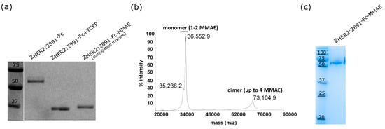 Conjugation of MMAE to ZHER2:2891-Fc. (a) The ZHER2:2891-Fc species before and after conjugation separated on 12% SDS-PAGE gel and subjected to Coomassie staining. The samples were heated (96 °C, 10 min) in non-reducing Laemmli buffer prior the electrophoretic separation; (b) The mass spectrum of the conjugation product; (c) The ZHER2:2891-Fc-MMAE conjugate migration on a native 12% polyacrylamide gel under non-reducing conditions stained with Coomassie [].