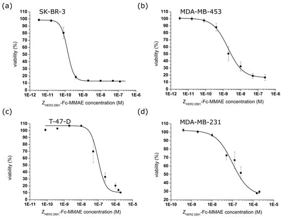 Cytotoxicity of the ZHER2:2891-Fc-MMAE conjugate. The conjugate was tested on four breast cancer cell lines: (a) SK-BR-3 (HER2+); (b) MDA-MB-453 (HER2+); (c) T-47-D (HER2-) and (d) MDA-MB-231 (HER2-). Error bars represent standard error of the mean (SEM).
