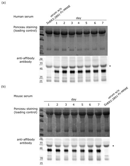 The stability of ZHER2:2891-Fc-MMAE in human and mouse sera was monitored by Western blotting with an anti-affibody antibody. The strong signal of the ZHER2:2891-Fc-MMAE conjugate was detected for each day of the 7-day incubation both in human and mouse plasma (Figure 6a,b). This indicates that in the above-mentioned conditions our construct remains relatively stable since the levels of the conjugate detected by the anti-affibody antibody were comparable between different days of the incubation.