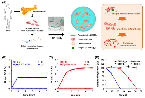 To address this unmet need, purely scaffold material-driven effects have been explored [13,14,15,16]. Controlling material properties at the cell–material interface (e.g., matrix stiffness and integrin–matrix interactions) can direct stem cell differentiation, which includes endothelial differentiation of mesenchymal stem cells (MSCs) [1,17]. For example, hydrogels have many advantages to mimic tissue properties due to tunable properties, including hydration and stiffness [18,19]. Moreover, their injectable format can provide a 3D microenvironment when cells are encapsulated and delivered to a target site. We previously developed an in situ forming gelatin−hydroxyphenyl propionic acid (GH) hydrogel. This hydrogel type was used as an injectable/sprayable platform upon a horseradish peroxidase (HRP)-mediated cross-linking reaction to deliver therapeutic cells and drugs [20,21,22]. In particular, this gelatin hydrogel, within a specific range of mechanical stiffness (0.5−3 kPa), was found to direct robust differentiation of mouse bone marrow-derived MSCs (mMSCs) into endothelial cells, and induce extensive vasculogenesis without any biological supplementation in vitro and in vivo [23].