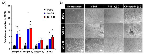 Integrin-mediated mechanisms at the cell–material interface. mRNA expression levels of mMSCs cultured for 15 days either on tissue culture polystyrene (TCPS) (control) or embedded in GH-7-L and GH-7-H hydrogels, * p < 0.05 vs. TCPS (n = 3) (A); Integrin inhibition effects on connectivity of blood vessels formed when mMSCs were cultured in GH-7-L and GH-7-H hydrogels. The experiment groups include mMSCs cultured on TCPS, GH-7-L, and GH-7-H gels for 15 days with no treatment, soluble vascular endothelial growth factor (VEGF), P11 (integrin αvβ3 inhibitor), and obtustatin (integrin α1 inhibitor). Scale bars indicate 200 µm (B).
