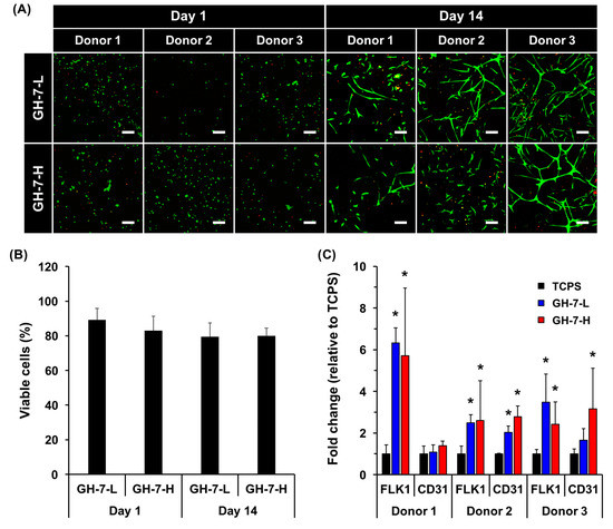 In vitro endothelial differentiation of patient-derived MSCs cultured in GH hydrogels. Live/dead staining images of hMSCs in GH-7-L and GH-7-H gels on days 1 and 14 post culture. Scale bars = 100 µm (A); Quantification of viable cells (%) at day 1 and 14 (B); mRNA expression levels of endothelial cell markers (FLK1 and CD31) in hMSCs determined by qRT-PCR after 21 days of culture in GH gels. As a control, the same number of cells was seed on TCPS. * p < 0.05 vs. TCPS (n = 3) (C).