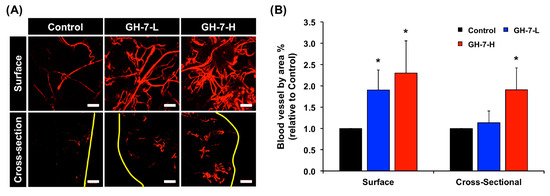 In vivo vascularization of hMSCs with GH hydrogels subcuntaneously delivered into nude mice. Representative images (surface and cross-section) of perfusable vasculature from delivered hMSCs in the GH gel loaded on polyvinyl alcohol (PVA) implants at two weeks post implantation. Yellow lines mark the surface boundaries of implants, and scale bars indicate 200 µm (A); Relative ratio of functional blood vessels by crosslinked GH-7-L and GH-7-H gels compared to non-crosslinked GH control (ratio = 1). * p < 0.05 vs. Control (n = 3, from mixed donor cell groups) (B).