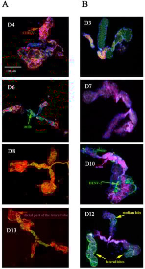 Distribution overtime of viral antigen in salivary glands infected by CHIKV and DENV-2. SG were collected at days 4, 6, 8, and 13 post-virus exposure for CHIKV and days 3, 7, 10, and 12 post-virus exposure for DENV-2 as indicated in panels A and B respectively. Viral antigens were labelled using anti-CHIKV 3E4 (panel (A) in red) or anti-DENV-2 4E11 (panel (B) in green) monoclonal antibodies. Nuclei were stained with DAPI and the actin network with Alexafluor 488 (panel (A)) or 633 (panel (B)) phalloidin; (C) CHIKV-infected salivary gland at day 11 post-virus exposure. CHIKV is labelled in red (Cy3-labelled 3E4 anti-E protein), the actin network in green (Alexafluor 488 phalloidin), and the nuclei in blue (DAPI). The salivary channel is shown by an arrow; (D) DENV-2 infected salivary gland at high magnification. The virus is labelled in green (4E11 anti-E protein monoclonal antibody) and nuclei in blue (DAPI).