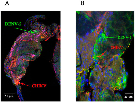 We then co-infected mosquitoes with DENV-2 and CHIKV and collected MG and SG at various times post-viral exposure. We detected both CHIKV and DENV-2 antigens in MG collected at 7 and 10 dpve (Figure 3A,C). We also detected both CHIKV and DENV-2 antigens in SG at 10 and 13 dpve (Figure 3C,D). Examination of the distribution of the two viruses in the distal part of the lateral lobe of SG collected at 10 and 13 days post-viral exposure showed double staining in many cells (Figure 3B,D).