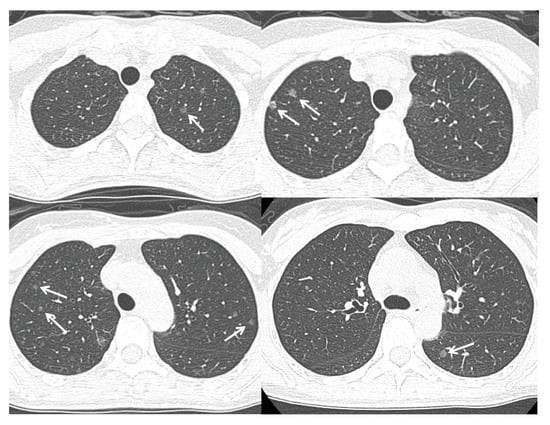 A 48 year-old non-smoking woman was found to have multiple subcentimetre ground glass opacities (arrows) in her bilateral lungs on a low-dose CT screening. Video-assisted thoracoscopic surgery with a right upper lobe wedge resection confirmed the diagnosis of synchronous multiple lung adenocarcinomas harboring the EGFR wild-type.