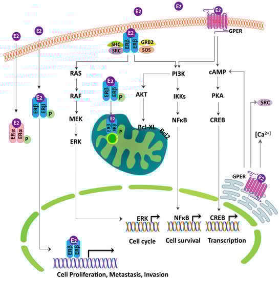 The putative role of the estrogen receptor in regulating the lung cancer cells growth. The estrogen receptor β (ERβ) appears to be the predominant form in lung cancer and is present in the cytoplasm, nucleus, mitochondria and plasma membrane. The ERβ has been found to activate the PI3K/IKK/NFκB, PI3K/AKT/Bcl-XL and the RAS/RAF/MEK/ERK signaling pathways to regulate the cell proliferation, invasion, metastasis, mitochondrial biogenesis and anti-apoptosis. The G-protein-coupled estrogen receptor (GPER) activates the cAMP/PKA/CREB and the PI3K/IKK/NFκB signaling pathways and acts as a modulator of the neoplastic transformation.