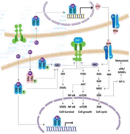 As aforementioned, the activities of the ERβ could be genomic or non-genomic [] (Figure 2). The estrogen-ERβ complex binds to the nuclear estrogen response elements directly or through the transcription factor, to promote the gene expression. Estrogen also combines with membrane-bound ERβ to activate the cytoplasmic signaling pathway and interacts with the EGFR signaling pathways [,] (Figure 3). EGFR has been reported to directly phosphorylate ER at specific serine residues (a ligand-independent signaling) in 87.5% of the ER-positive lung tumors [,]. In addition to the MEK/ERK signaling pathway, estrogen also activates the PI3K/AKT signaling pathway, another downstream pathway of the EGFR activation, to promote lung cancer cell metastasis through epithelial mesenchymal transition []. Other non-genomic activities have also been explored. Fan et al. found a higher ERβ expression in the lymph node as compared to the primary tumor tissues, and estrogen promotes the lung cancer cell metastasis via the ERβ-mediated up-regulation of the matrix-metalloproteinase-2 []. In the mRNA analyses, when comparing the high versus low ERβ expressing tumors by the group of Siegfried and Stabile, the top differentially expressed genes in the high ERβ tumors involved the fibroblast growth factor signaling and the human embryonic stem cell pluripotency [].