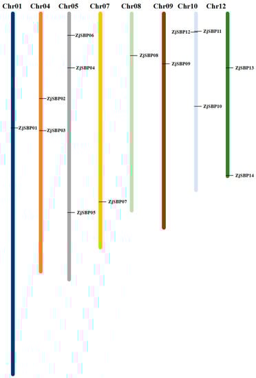 In Group 5, CNR has been found to be critical for normal ripening in the tomato [18]. AtSPL8 was clustered in this group. Some reports found that AtSPL8 played a significant role in male fertility and anther development [9,38]. ZjSBP06 and ZjSBP11 are in Group 6, which contains AtSPL2, AtSPL10 and AtSPL11. Notably, AtSPL2 was the homologous gene with ZjSBP11. These three genes have been reported to control the development of lateral organs in association with shoot maturation in the reproductive phase [39].