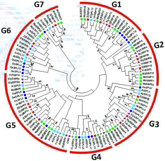 In order to further understand the evolutionary relationship of the ZjSBP genes and help to reveal roles of these ZjSBPs in jujube development, we employed 111 putative SBP sequences from six species, including monocotyledonous angiosperms (rice) and five dicotyledonous angiosperms (Arabidopsis, apple, grape, tomato and jujube) to construct a phylogenetic tree using MEGA 7.0 [29] (Figure 3). Only the conserved SBP domain (74 aa) were used for the phylogenetic tree construction (Table S1). These 111 sequences were classified into seven groups. Interestingly, all the OsSPL genes in each group were very dissimilar to other dicotyledons and most of the ZjSBP genes were closer to grape, apple, tomato and Arabidopsis than rice. The ZjSBP genes were distributed in all the groups.