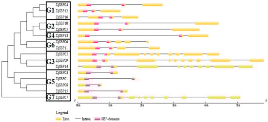 Phylogenetic analysis of jujube SBP domain proteins and exon-intron structures with the online Gene Structure Display Server. Exons and SBP domains are indicated by yellow and pink boxes. Black lines connecting two exons represent introns.