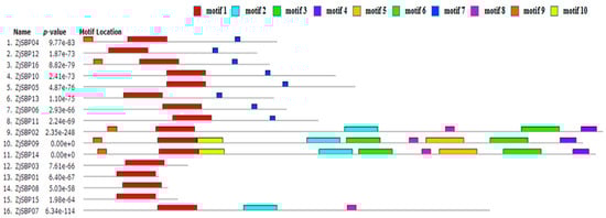 The motifs of each ZjSBP gene by MEME. Numbers 1–10 are displayed in different colored boxes. The sequence information for each motif is provided in Table 2.